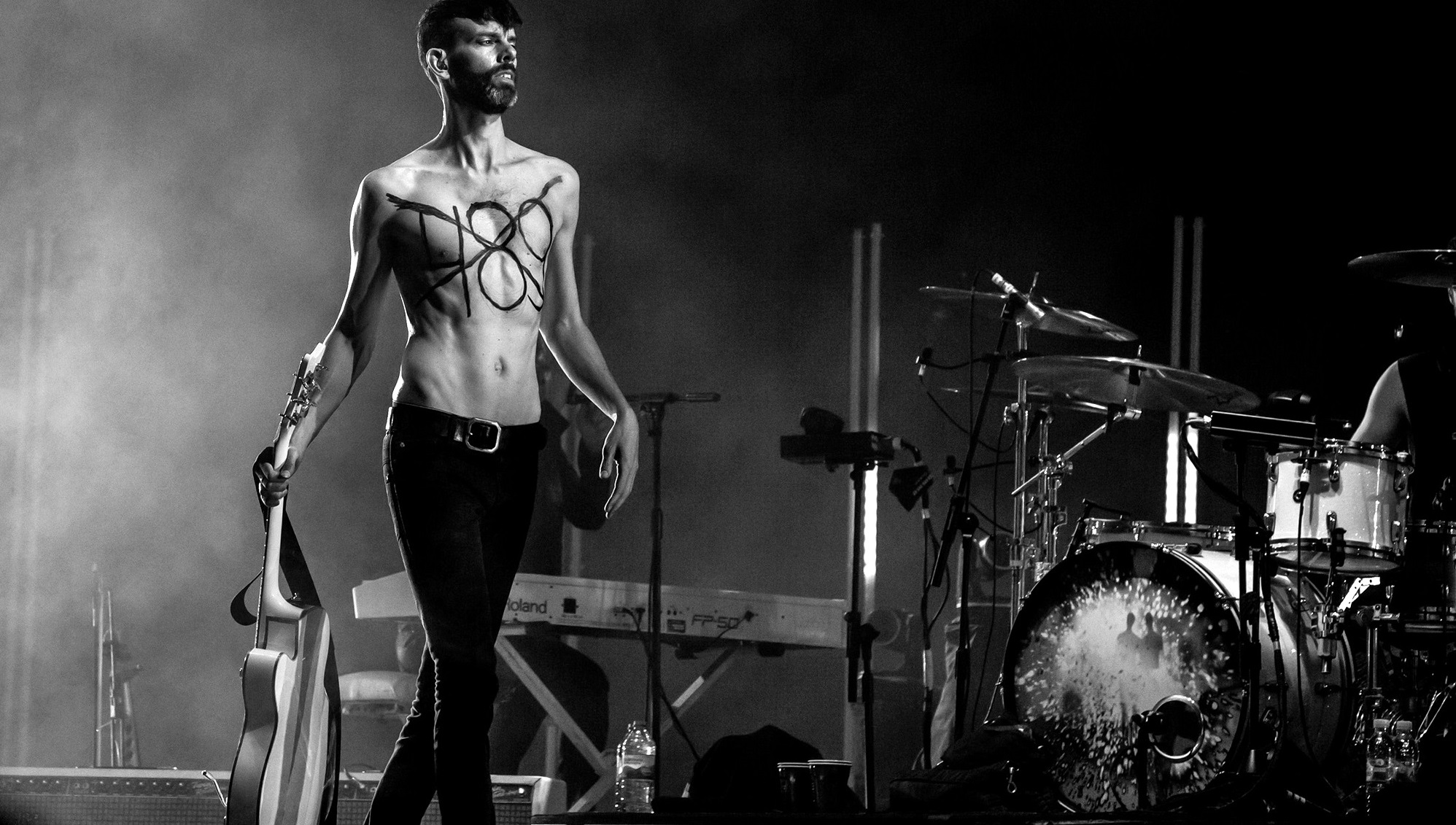 Stefan Olsdal, qui a notamment grandi au Luxembourg, a fait sensation en exhibant une guitare arc-en-ciel et le chiffre "489" barré sur la poitrine. (Photo AFP)