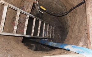 This Handout image obtained February 24, 2015 from the Toronto Police in Canada, shows a ladder going down into a tunnel found near York University. Toronto’s deputy police chief asked for the public’s help Tuesday in determining who built a mysterious tunnel near a major sporting venue and a university in Toronto, and why. A wildlife official was walking through woods near York University and the Rexall Center last month when he spotted a piece of corrugated metal on the ground, lifted it up and found a passageway. Deputy police chief Mark Saunders said the tunnel was more than six feet (1.8 meters) high, almost three feet (0.9 meters) wide and about 33 feet (10 meters) long, and was hidden in a densely wooded area of the city, « well off the beaten path. » Had it continued, the tunnel would have exited on the other side of a hill overlooking nearby tennis courts and a sports facility that will host the Pan American Games in July. AFP PHOTO / HANDOUT / TORONTO POLICE == RESTRICTED TO EDITORIAL USE / MANDATORY CREDIT: « AFP PHOTO / HANDOUT / TORONTO POLICE « / NO MARKETING / NO ADVERTISING CAMPAIGNS / NO A LA CARTE SALES / DISTRIBUTED AS A SERVICE TO CLIENTS ==