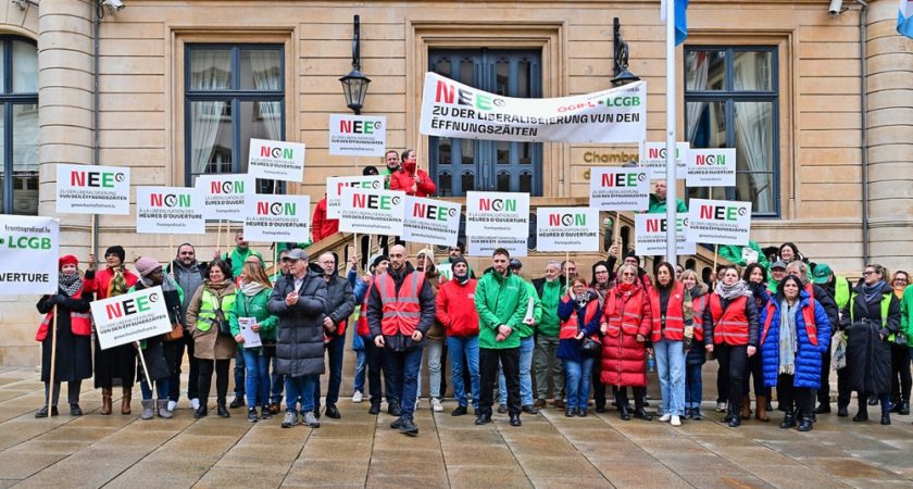 Un piquet de protestation, organisé devant la Chambre des députés, avait pour objectif de sensibiliser les députés en amont d’une réunion de la commission parlementaire du travail. Le LSAP avait fait convoquer les ministres du Travail et de l’Économie, Georges Mischo et Lex Delles, pour discuter des deux projets de lois portant sur l’extension du travail dominical et l’élargissement des heures d’ouverture.