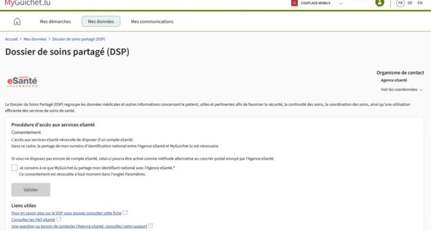 Mais jusqu’à présent, sa consultation était rendue compliquée par les démarches nécessaires pour y accéder. Le patient devait demander un code et attendre de le recevoir par voie postale pour s’authentifier. Désormais, la procédure peut se faire entièrement sur MyGuichet.lu, qui permet d’activer son compte eSanté en ligne et ainsi d’accéder à son DSP. Il suffit pour cela d’avoir un produit d’authentification LuxTrust et un espace privé sur MyGuichet.lu.