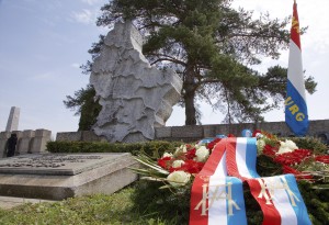 20130418 Mauthausen / AUTRICHE: Le drapeau luxembourgeois flottant auprès du monument représentant la forme géographique du Grand-Duché. Photos d'illustration du Camp de concentration et d'extermination nazi de Mauthausen près de la Ville de Linz en Autriche (photographié le 18 avril 2013), Mauthausen est un des très rares camps quai en état original de l'univers tortionnaire nazi. (Photos en provenance des archives Luxpress ressemées 5 mai 2015 pour Editpress) © LUXPRESS/Jean-Claude Ernst