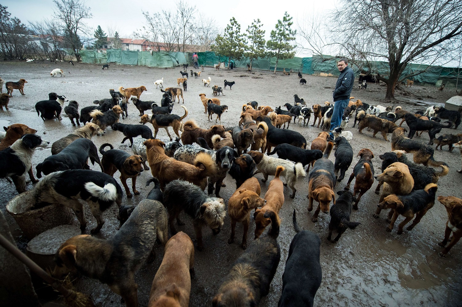 Sasa Pesic, advocate for stray dogs, walks through the shelter in Nis, 200 km south of Belgrade on January 28, 2015. Sasa Pesic was just one among thousands of Serbia’s jobless when the finding of four abandoned puppies brought a dramatic change into his life. Eventually becoming a stray dogs protector Pesic is now taking care of more than 450 of those animals in his asylum in the southern town of Nis and knows each of them by name. AFP PHOTO / ANDREJ ISAKOVIC