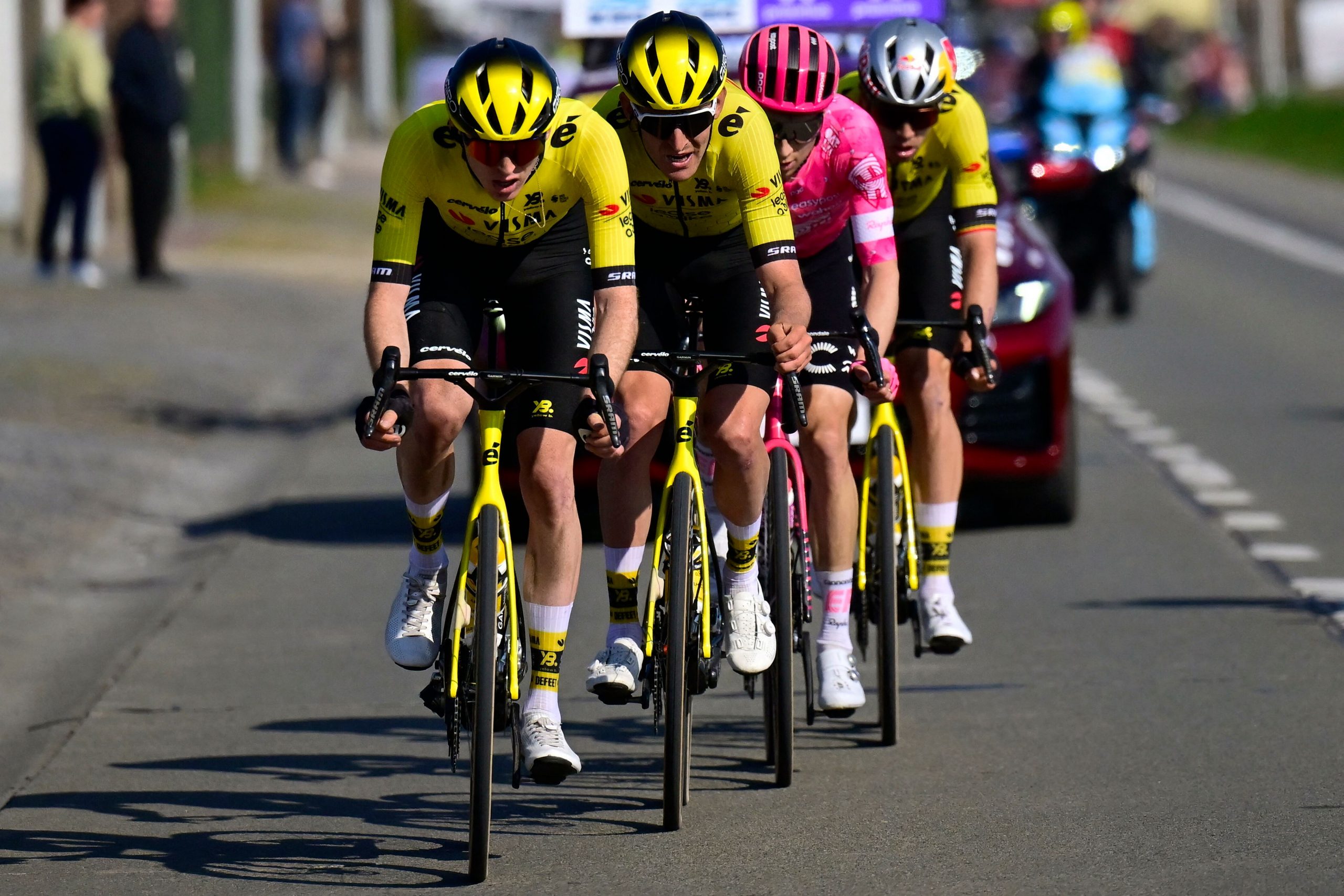 L’équipe Visma-Lease a Bike, ici emmené par Matteo Jorgenson devant Tiesj Benoot ,a fait fort ce mercredi dans À Travers la Flandre. Sauf à l’arrivée où Neilson Powless s’est finalement joué de Wout Van Aert (Photo : AFP).