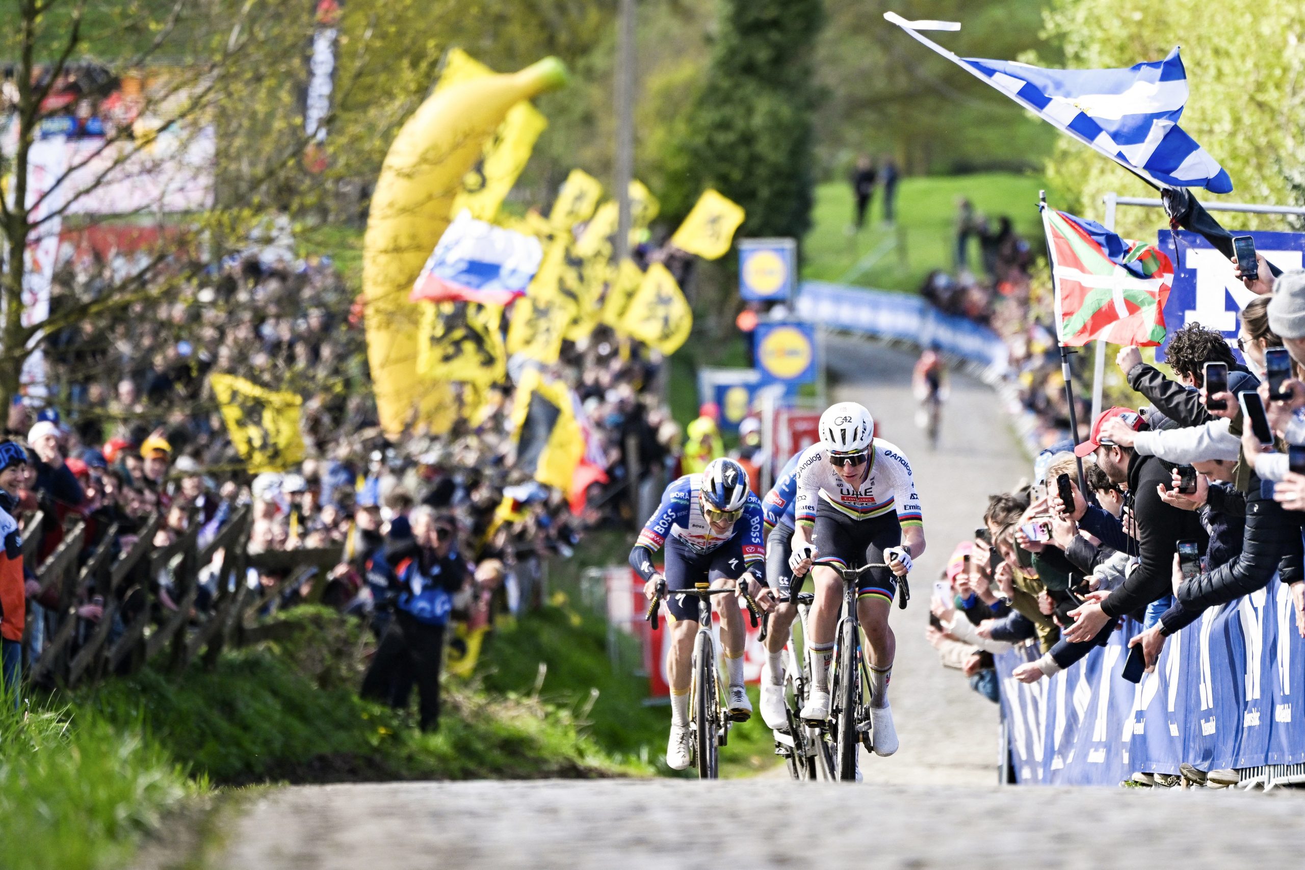 Pogacar a commencé son œuvre dans le premier des trois passages du Vieux Quaremont où on a eu droit, brièvement, à l’image incroyable de retrouver les quatre favoris épaule contre épaule en tête de la course, avant que l’écrémage ne ramène tout le monde à sa place. Au final, tout le monde était content.
