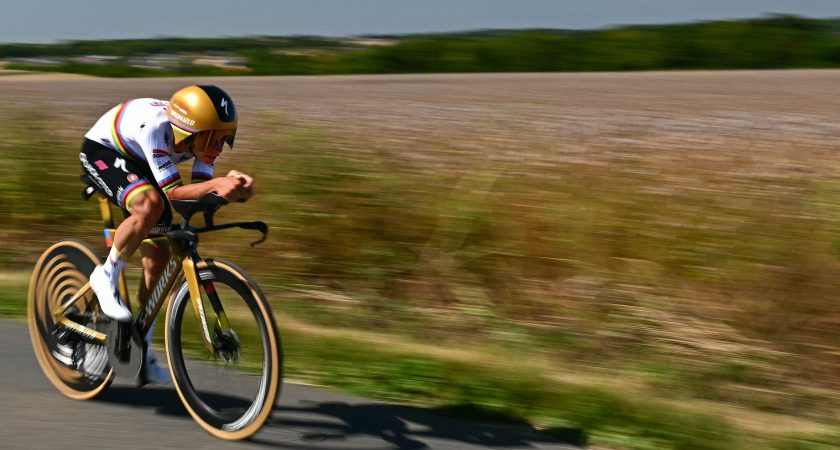 Le Flamand, coiffé d’un casque doré depuis son doublé olympique, est quasiment invincible dans l’exercice. Il a remporté les six derniers chronos auxquels il a pris part, et 9 sur 12 depuis le début de l’année 2024. Il a bouclé le parcours en 36:42 à une moyenne affolante de 54 km/h.