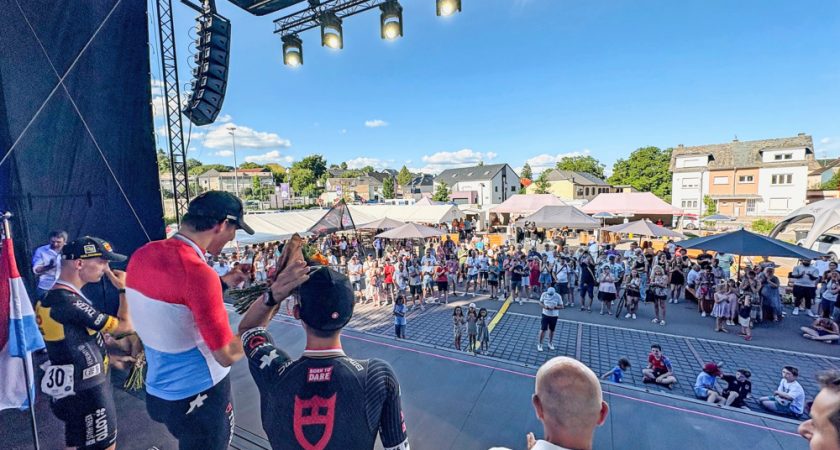 Le champion a pu savourer avec émotion son succès sur le podium, devant une foule garnie sur la place de Mertzig. Un sacre sous le soleil pour le coureur de 24 ans, qui peut partager sa joie avec son coéquipier Luc Wirtgen.